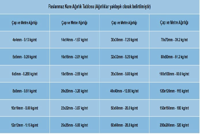- Paslanmaz Çelik Kare
